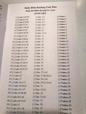 This is a reading plan that I am making available for anyone who would like to read their bible through in one year. This plan divides reading schedule into three sections in Old Testament, New Testament, and the Psalms. This plan will also have you reading the Christmas story at Christmas, Easter story at Easter and so on. These are available for free. Just contact me for your reading plan.